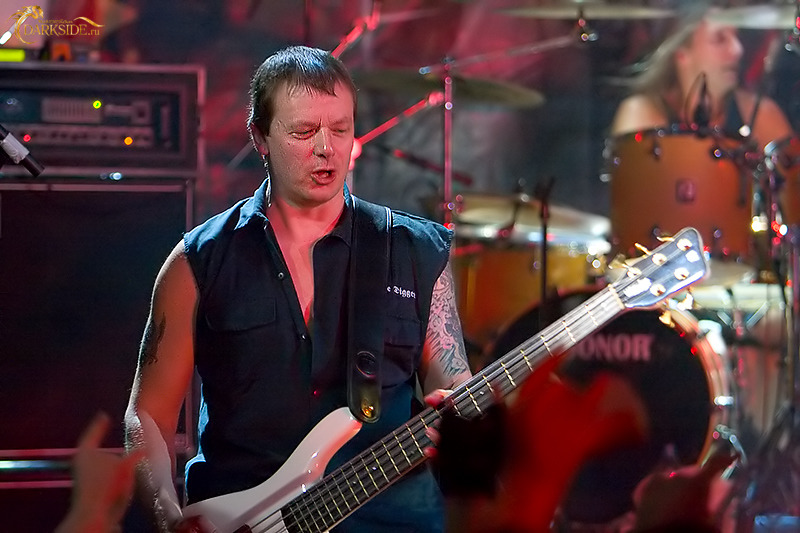 Проблемы со звуком, который был практически идеальным для исполняемой в тот вечер музыки – плотным, четким и без малейшей перегрузки, возникли лишь однажды. В тот момент, когда на последней в основном сете “Rebellion” партия волынок должна была органично слиться с гитарным соло, произошел небольшой перегруз – звук подкладки сделали явно громче, чем нужно. Но эта досадная мелочь оказалась по сути единственным, за что в тот вечер можно было упрекать немцев – по всем остальным параметрам концерт был сыгран на твердую пятерку. Приятно и то, что Крис не только не забыл теплый прием в клубе “Точка” 3 года назад, но и не оставил без внимания скандирования фанатов в 2007 – специально на московском шоу программу расширили, и на первый бис прозвучало не два трека, как было заявлено в сет-листе, а три. Бонусной вещью оказалась “The Grave Dancer”, выгодно разбавившая два среднетемповых номера, давших в 2007 и 2001 году соответственно названия для альбомов тевтонских хэви металлистов.