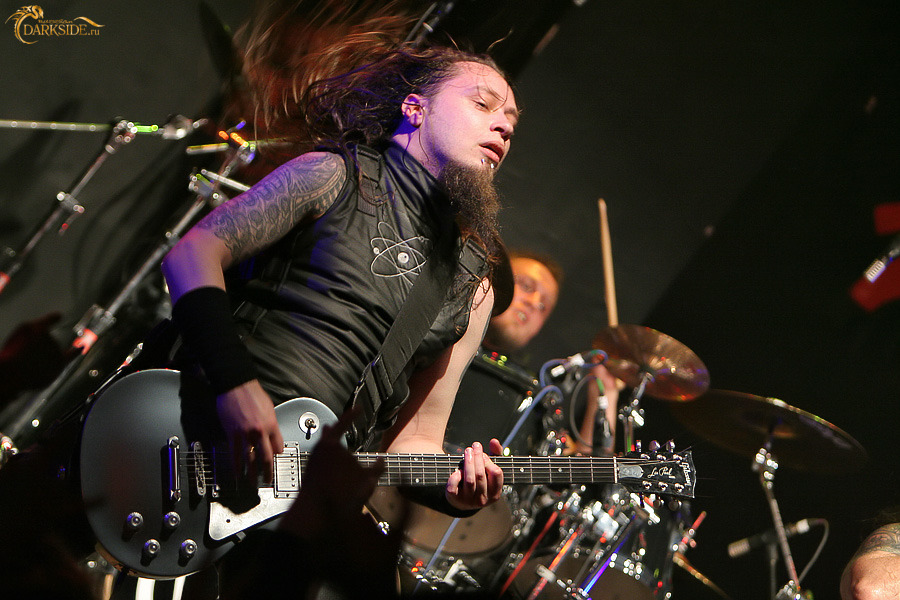 Монструозная "Grinfucked", пожалуй, стала одним из самых ярких моментов вечера – то разгоняясь, то нарочито притормаживая, эта сумасшедшая вещь прямо-таки придавила зал своей нечеловеческой массой. Сменила её стремительная, режущая ухо и разрывающая плоть "Nothing's Wrong?" – кровожадная вещь с дебютника DevilDriver. Мошпит снова стал расширяться, а поток стейдждайверов увеличился настолько, что на помощь к техникам группы стали приходить охранники "Точки". А группа, меж тем, исполнила монументальную "These Fighting Words" – схожую с "Horn of Betrayal" по мелодик-дэтовой основе вещь. За ней была среднетемповая, но от того не менее драйвовая "Burning Sermon" – массивный боевик с явным хардкоровым влиянием.