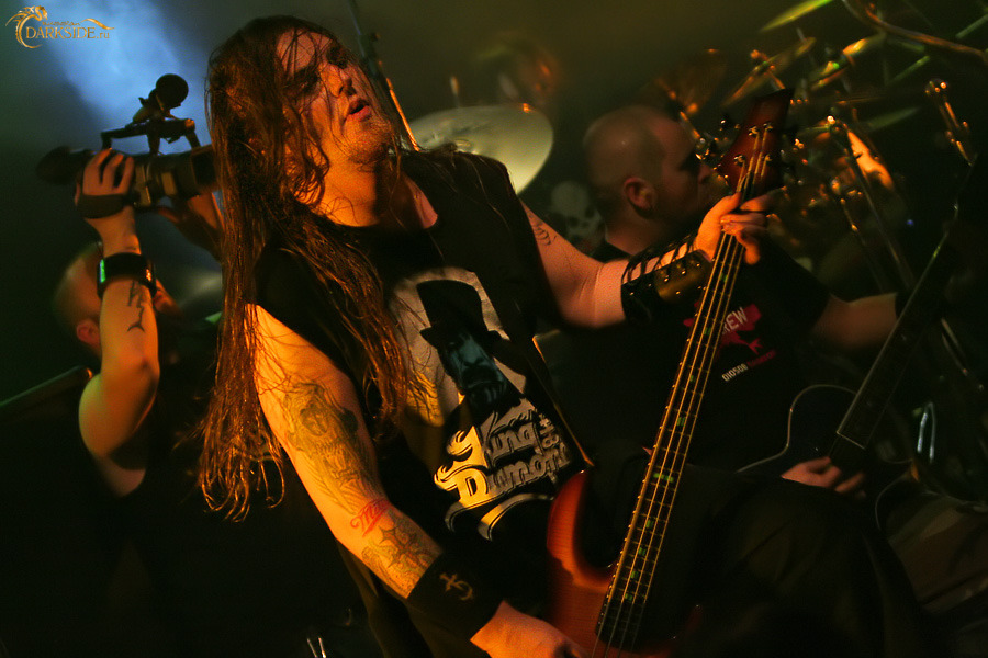 Но более тянуть было нельзя, и ударник дал отсчёт к открывающей вещи – "Not All Who Wander Are Lost". В первые же секунды после того, как "Точка" скрипнула от залпа дьявольских гитар и драйверских барабанов, у сцены началось нечто невообразимое. Народ стало шатать волнами чуть ли не от одного края сцены к другому, сзади в спину врезались гости из разросшегося мошпита, а по голове пару раз приветливо заехали ботинками стейдждайверы. Решив не испытывать судьбу, я потихоньку, хоть и не без труда, покинул эпицентр сего взрывоопасного действа и, обойдя кругом мошпит, встал снова прямо напротив Деза, правда, уже в противоположном конце партера. Пока я совершал все эти чапаевские манёвры, DevilDriver отгромыхали уже упомянутую открывающую вещь – мощнейший хит с последнего альбома, который, тем не менее, был ознаменован не очень ещё хорошо отстроенным звуком. Уже к следующей песне звук отрегулировали, и всю остальную часть шоу группа отыграла в вполне приличном для "Точки" звуке. Правда, вечный бич металлических концертов – кашеобразные ритм-гитары – так и остался в почётном статусе вечного бича.