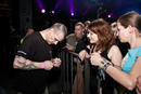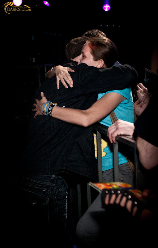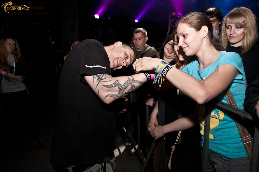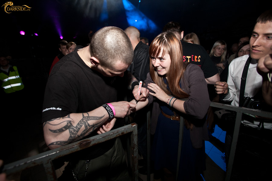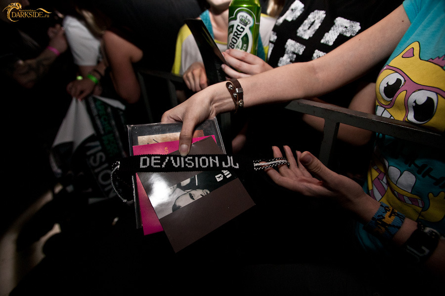 Минут через 15 Томас спускается в зал для раздачи автографов и фото со всеми желающими. Расписывался на всём и много. Одна из фанаток умудрилась подставить попу, чтобы получить на ней заветную закорючку, чем вызвала у музыканта и окружающих щенячий восторг. Сфотографировавшись со всеми желающими и поставив последнюю роспись, Томас удалился во тьму гримёрки, но ненадолго… Очевидно поняв, что у девушки не достает артефакта, он вернулся со Штеффаном, приведя его с довольным видом чуть ли не за ручку. Девушка поняла, что к чему, вновь приспустила штаны и получила уже полный комплект от De/Vision. Это сильно приободрило вокалиста, и он, так же как и Томас, подписал целую кипу буклетов и не отказал в фото всем желающим.